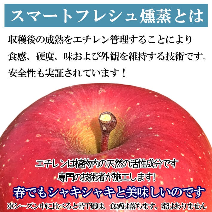 りんごは収穫から時間が経つと自身が放つ「エチレンガス」の影響で老化が促進され、果肉がボソボソ・モサモサ状態になってしまいますが、この影響を軽減するのが「スマートフレッシュ処理」と呼ばれるものです。